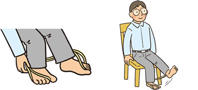 1.ゴムバンドを輪にして結びます。(ゴムバンドの種類や輪の大きさで、筋肉にかかる負担が異なりまするので、担当医に相談しましょう。スポーツ用品店でも、アドバイスを得られるでしょう)椅子に深く腰かけ、ゴムバンドを片方の足の第二指から第五指にかけます。